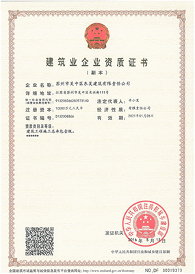 蘇州市吳中區東吳建筑有限責任公司,具有房屋建筑施工總承包一級、裝飾裝修工程設計與施工二級一體化資質、機電設備安裝三級資質、市政公用總承包三級資質企業,通過ISO9001質量管理體系認證、資信等級AAA級。